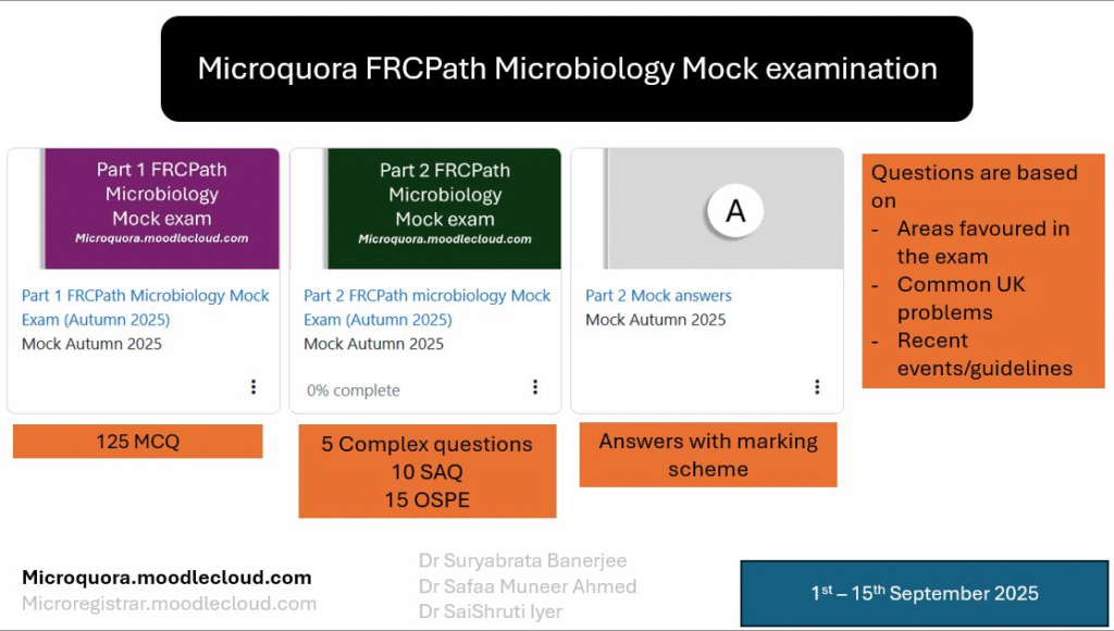 Microquora Mock FRCPath Microbiology examinationby Suryaon Posted on July 22, 2025September 12, 2025 Part 1 and Part 2 (September 2025) Registration Link: https://docs.google.com/forms/d/10SorRCuGNfa3mzIZ7Q-xjuL-sFUXrUaMz5Tl7PbxdTs/viewform?edit_requested=true For information email: frcpathpreparatorycourse@gmail.com